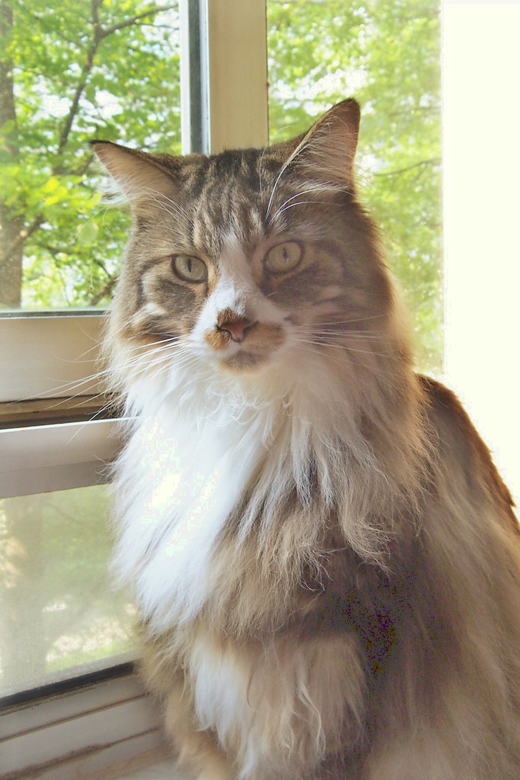 This is Smudge, Lester’s half-brother. He is an imp. One of his favourite tricks is to bat at the thread as I’m trying to get it in the needle. Sometimes it’s very frustrating. He has some very odd habits such as meowing incredibly loudly in the middle of the night as he sits on the bedroom windowsill looking out on the roof garden. He’s a definite lap kitty and would, if we would sit still that long, stay on a lap for 2 or 3 hours at a time.