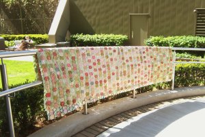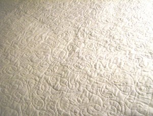 This has now been quilted. The long-arm quilter did the most beautiful work on it. Unfortunately, we can’t get a good overall shot because of the size of it — it’s 122 by 86 inches. As soon as I get the binding on, we’re taking it to a friend who has a professional photography set-up and getting some good photos.