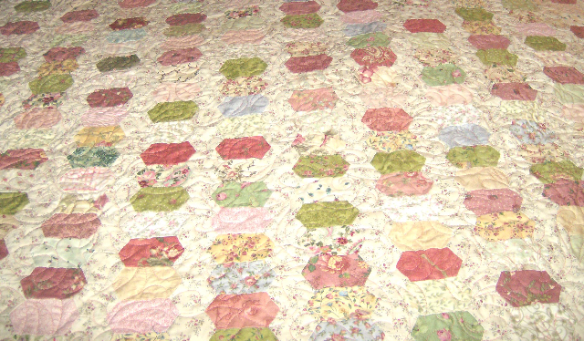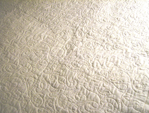 This has now been quilted. The long-arm quilter did the most beautiful work on it. Unfortunately, we can’t get a good overall shot because of the size of it — it’s 122 by 86 inches. As soon as I get the binding on, we’re taking it to a friend who has a professional photography set-up and getting some good photos.