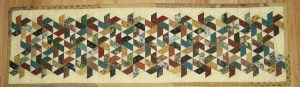 Another finish! This one was a challenge. I used — silly me — a black print fabric for the backing. Black fabric seems to attract cat hair much more than any other fabric colour! For that reason, I decided to put the binding on totally by machine, which I don’t like doing. However, it was better than having this on my lap while I tacked down the binding — as I very rarely am allowed to do that without a kitty helper! LOL And it’s one more finished item for Christmas. These are not my normal colours to work with and, while I know it’s perfect for the recipient, I really had to push myself to keep stitching the little pinwheels together.