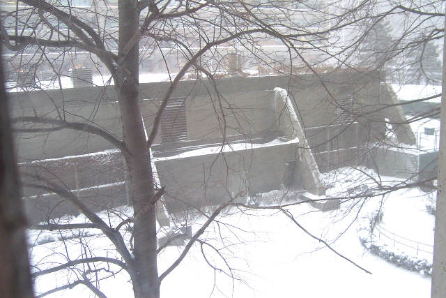 We had a huge, huge snowstorm today. We even had thunder snow, which is the oddest thing. When we got up this morning it was snowing. About an hour or so later, we saw lightning and heard a couple of huge claps of thunder. Then it snowed and snowed and snowed till about 9:00 tonight. This is a view of the roof garden from our window. At one point this afternoon, I looked out and saw rather large paw prints in the snow. Wonder what could possibly be out there — a raccoon maybe? No pets are allowed on the roof garden and, for that matter, it’s closed for the winter so no one could have got out there.