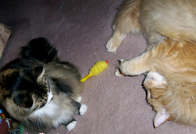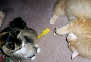 A friend sent us a new cat toy for the boys. It has been hysterical watching the antics of the two of them with the “Canary Toy”. First they played:
