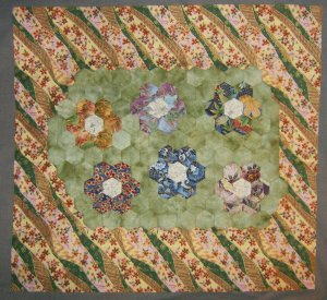 As there are stitching lines on every piece, I just took the thread out of the sewing machine and stitched along those stitching lines on the outside pieces of the flower garden. Then, I quickly basted the flower garden to the border fabric and appliqued it while we watched the Masters. Thanks to the perforations from the stitching, the turning under went really quickly.