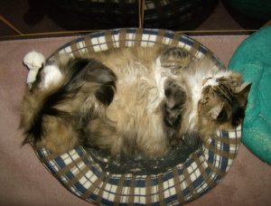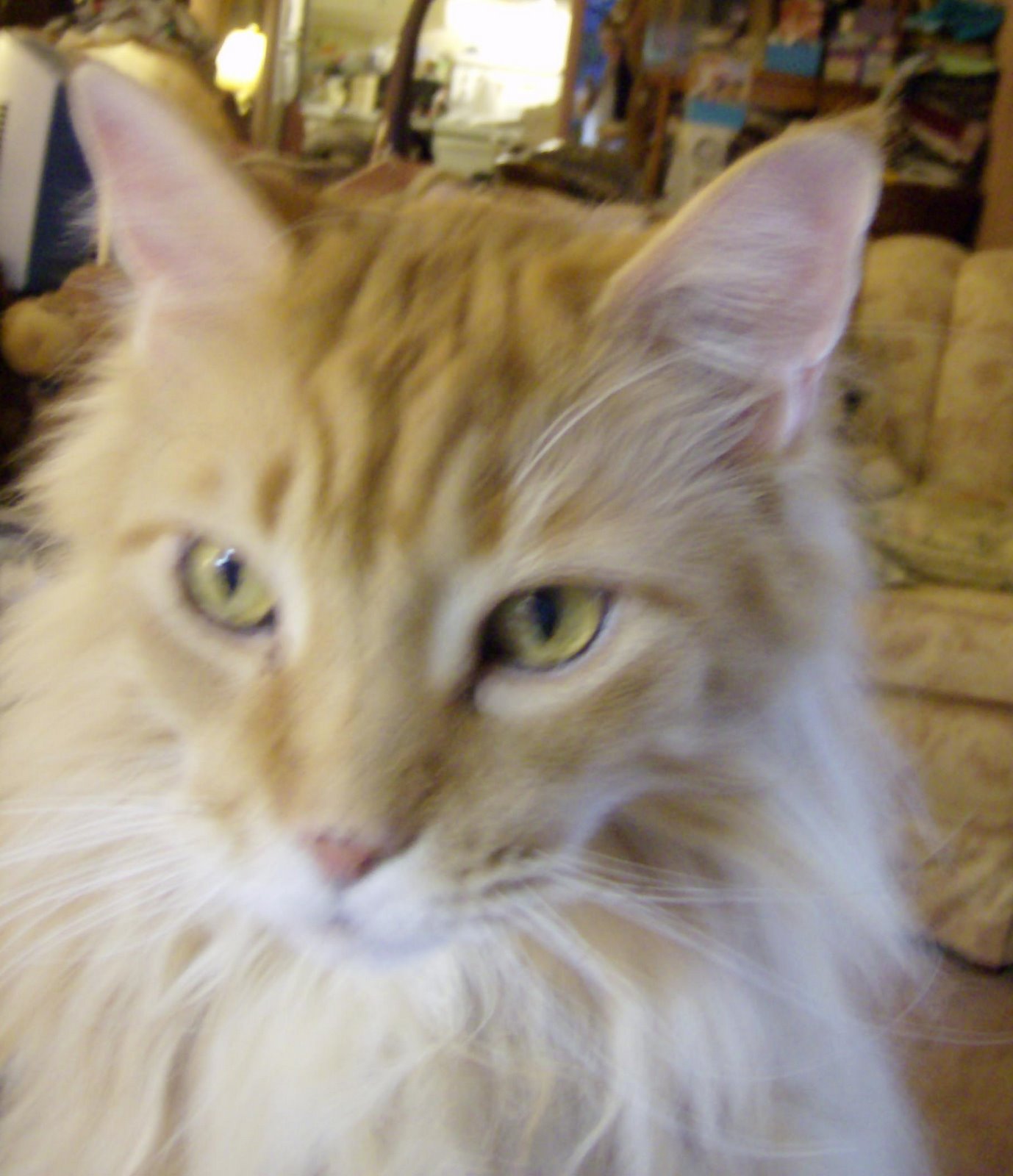 Lester, in soft focus, looking very elegant. This is totally misleading. He is very goofy. Start patting him and he immediate starts licking and chewing on his ruff. Does a very good imitation of a worm as he wiggles his way across the carpet in the living room or the duvet in the bedroom. He is a very comical cat!