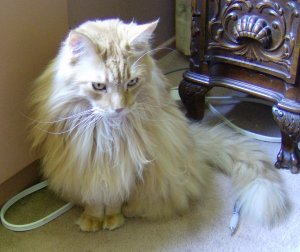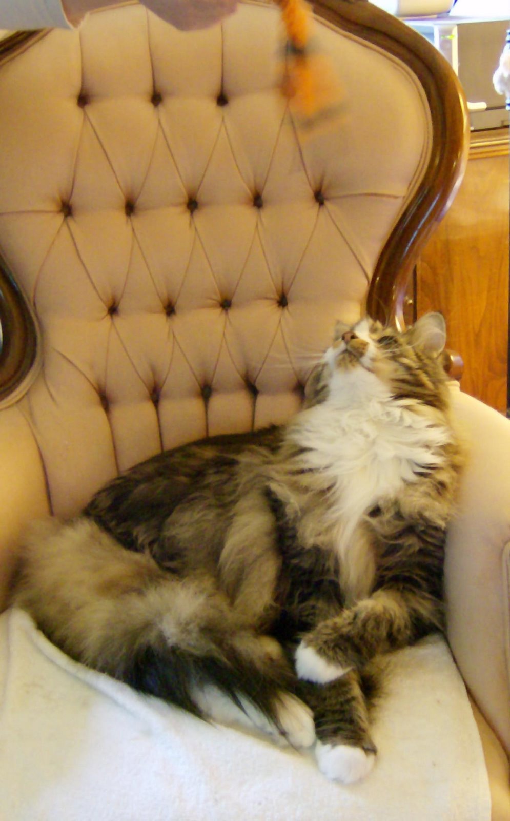 This is Smudge about one second before he reached up to get the kitty toy (the blurry orange thing at the top of the chair).