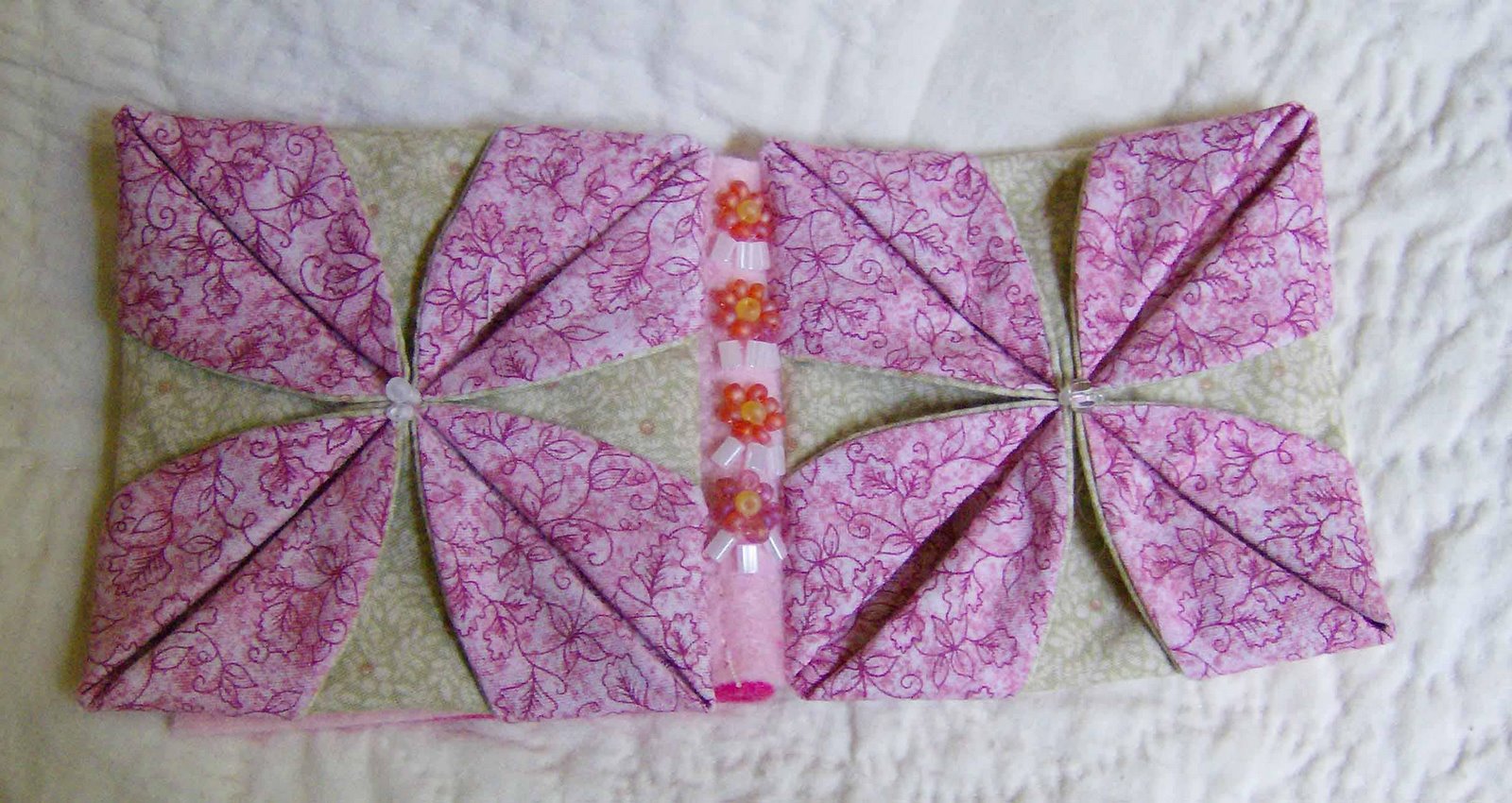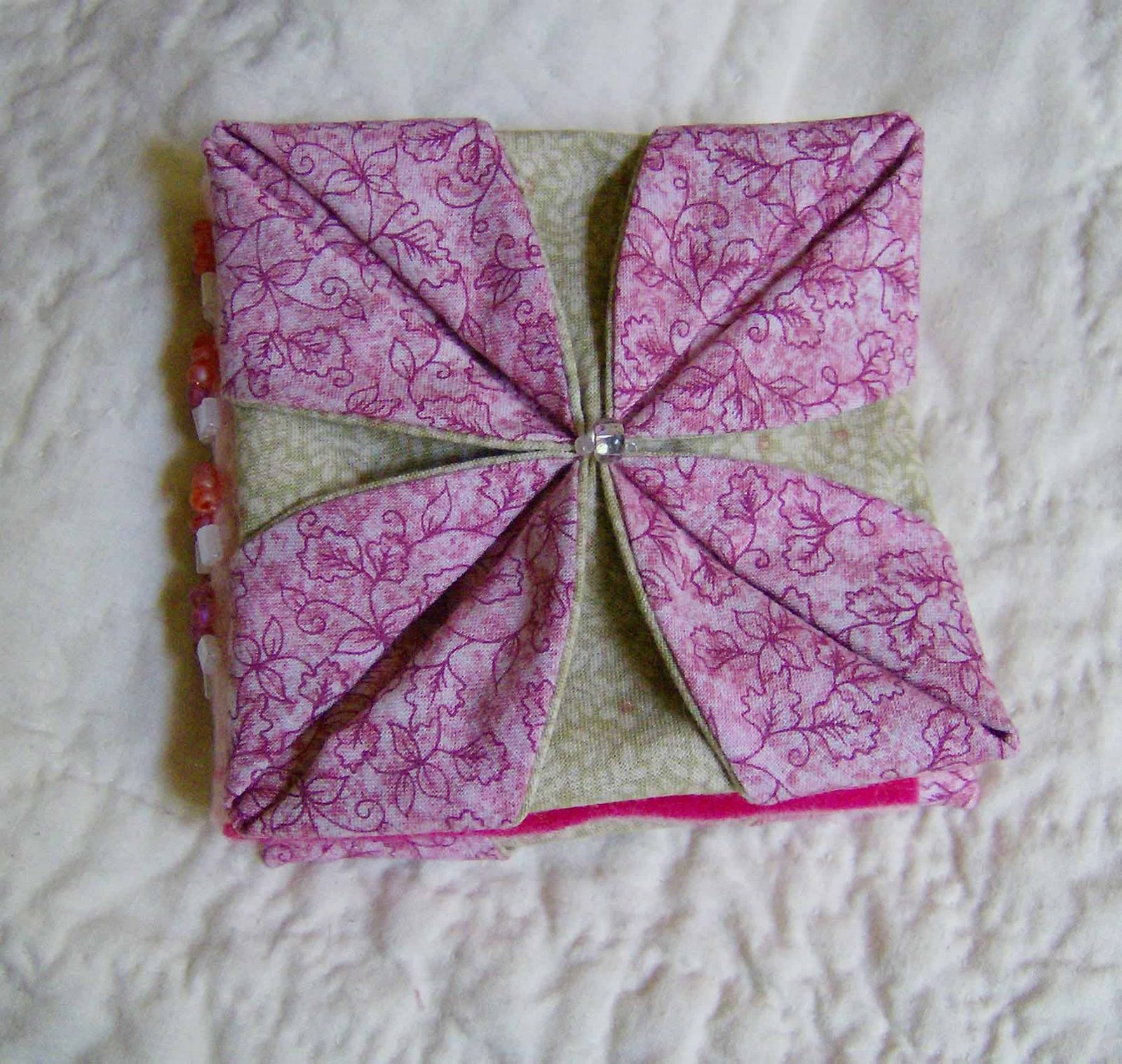 I have been dying to try some fabric origami from Kumiko Sudo’s books. This design for a little needle case is from her Flower Origami, Fabric Flowers from Simple Shapes book.
