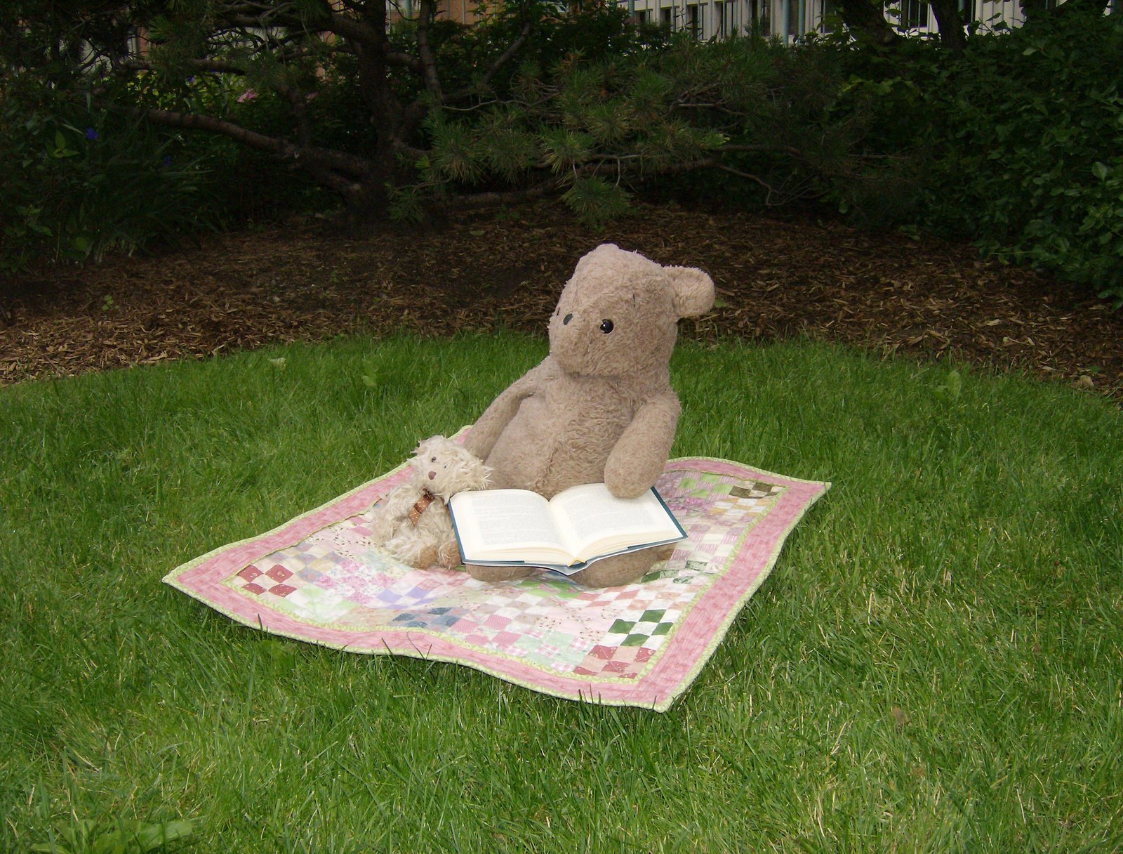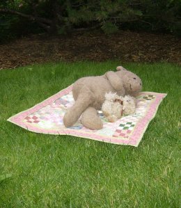 Then Tiny Bear had to investigate too. “Beebs,” said he, “this is fabulous! Now we have a quilt to sit on when we come out to the garden.”