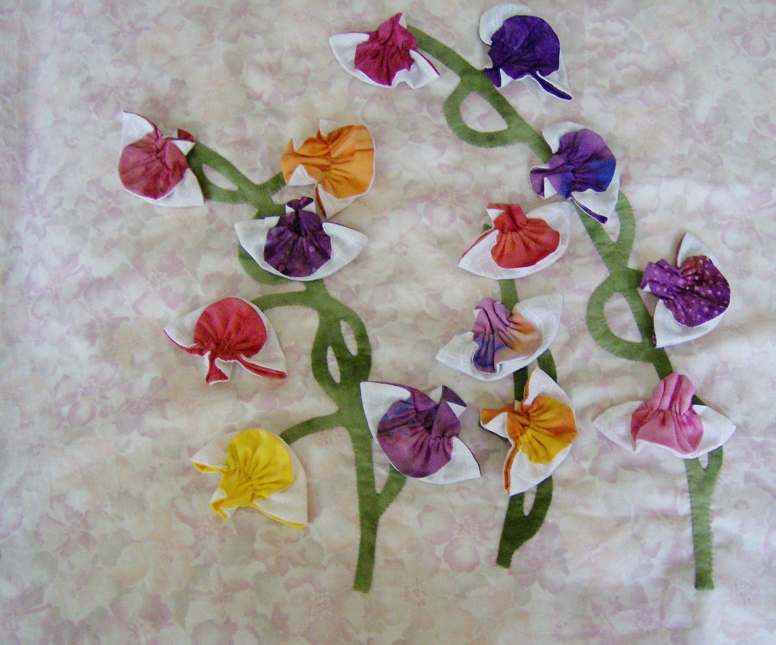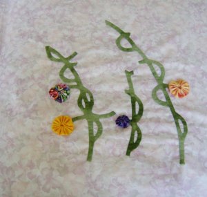 Hi Cathi,How about mixing the yoyos and the folded flowers (#3 option)? I tend to agree with about the orchids…you think you might just applique the orchids in the border of the quilt by themselves?