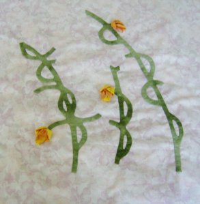 The stems and branches are appliqued on. The orchids are, I think, perhaps too large and overpowering for the stems. I have to make a decision and would love some opinions on this.