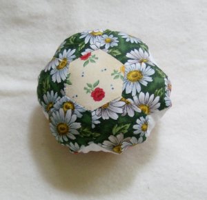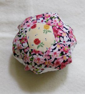 After making the starfish pincushion, I wondered what one would look like made with 2 grandmother’s flower garden blocks. So I grabbed 2 GFG blocks I had stitched together and six one-inch diamonds and made this pincushion.