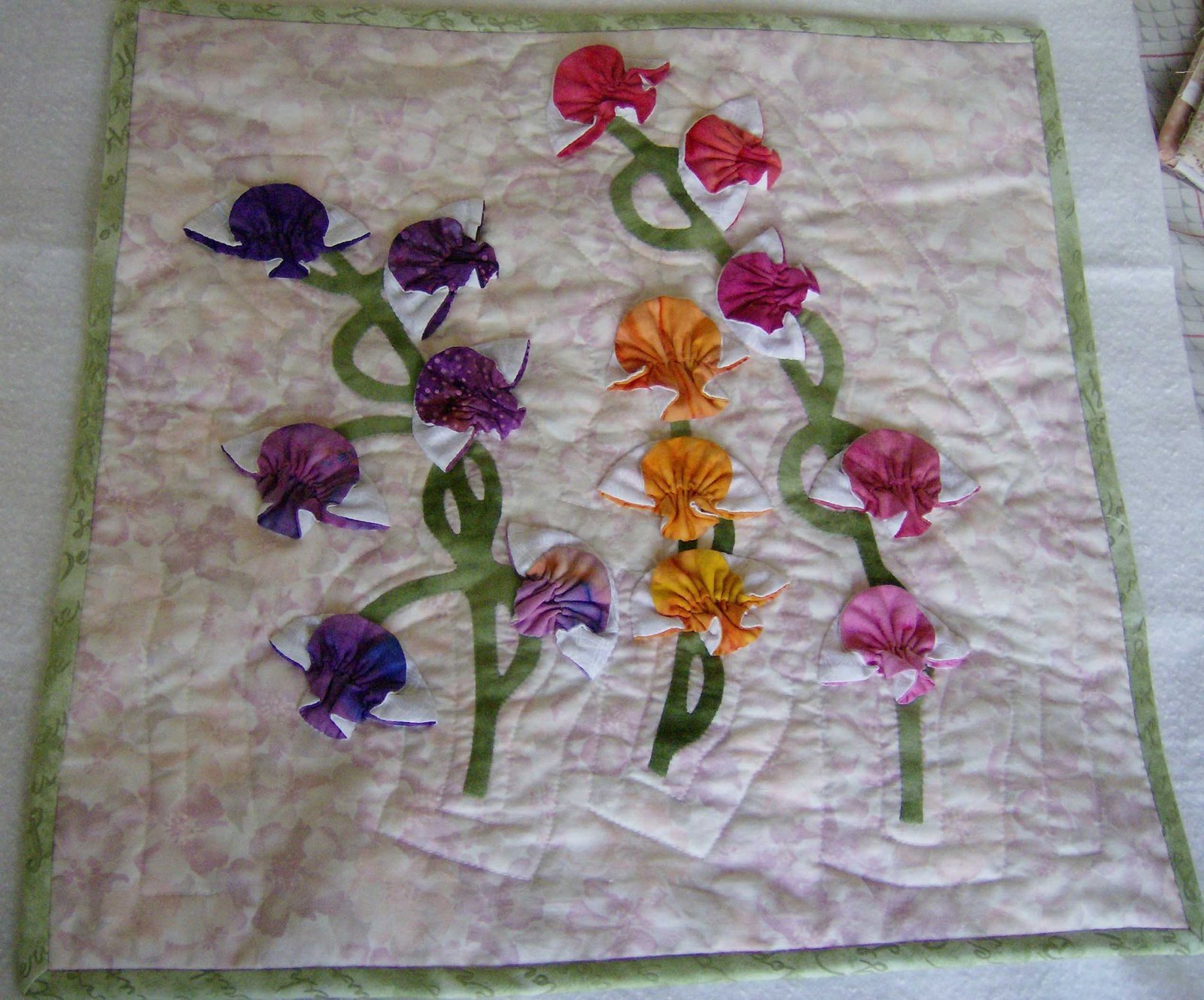 I decided to go with the folded orchids for the Four Seasons quilt and this is it — finished for all but the label on the back. The label is ready but I had to give my hands a rest as it seems applique is now another thing that triggers the pain/inflammation. What a nuisance!