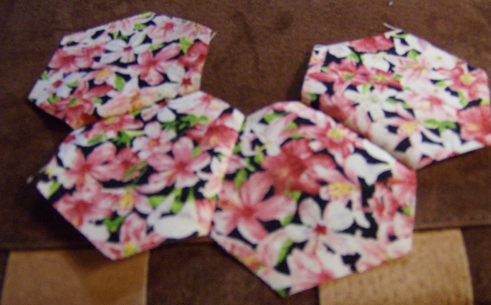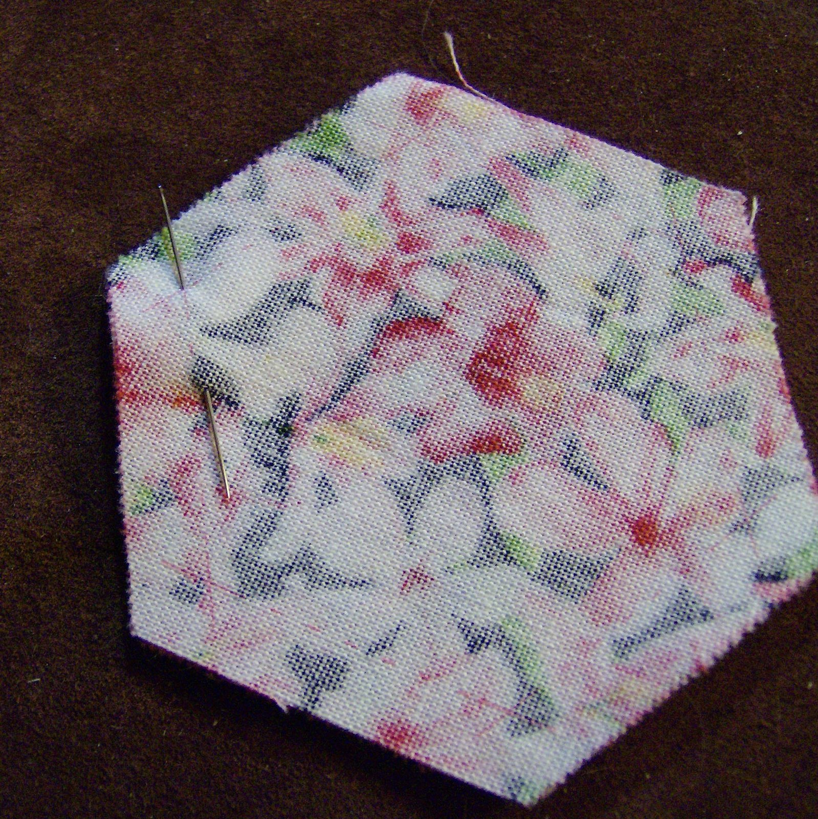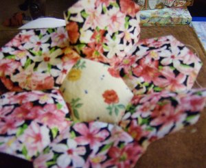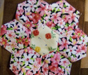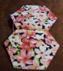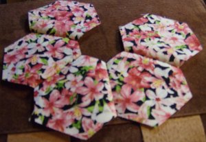 This flower will be made with 6 one-inch hexagons of one fabric and 1 one-inch hexagon of a different fabric in the centre.