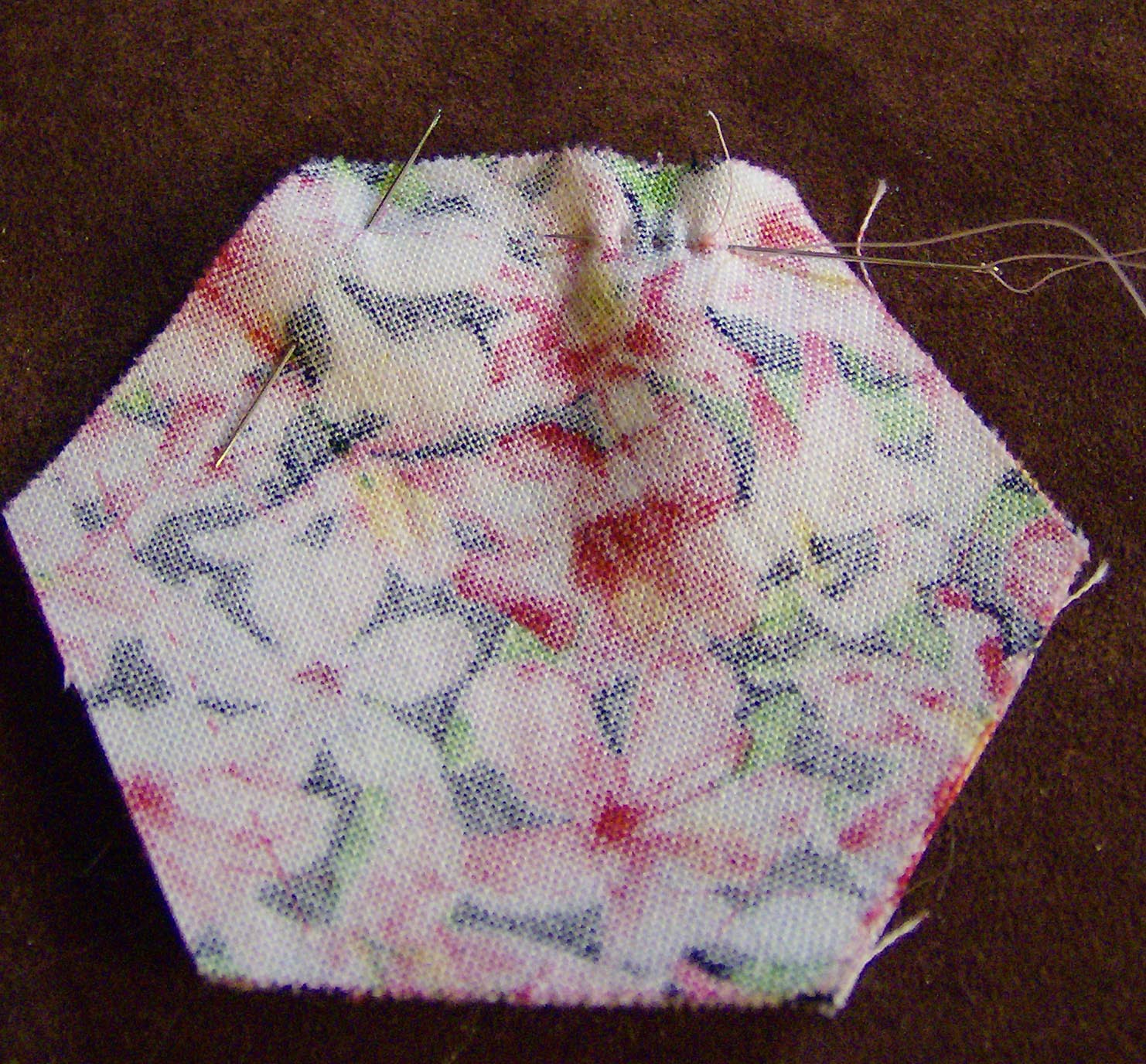 Materials needed:  six hexagons for outer circle of 6, one hexagon for centre, needles and fine thread.