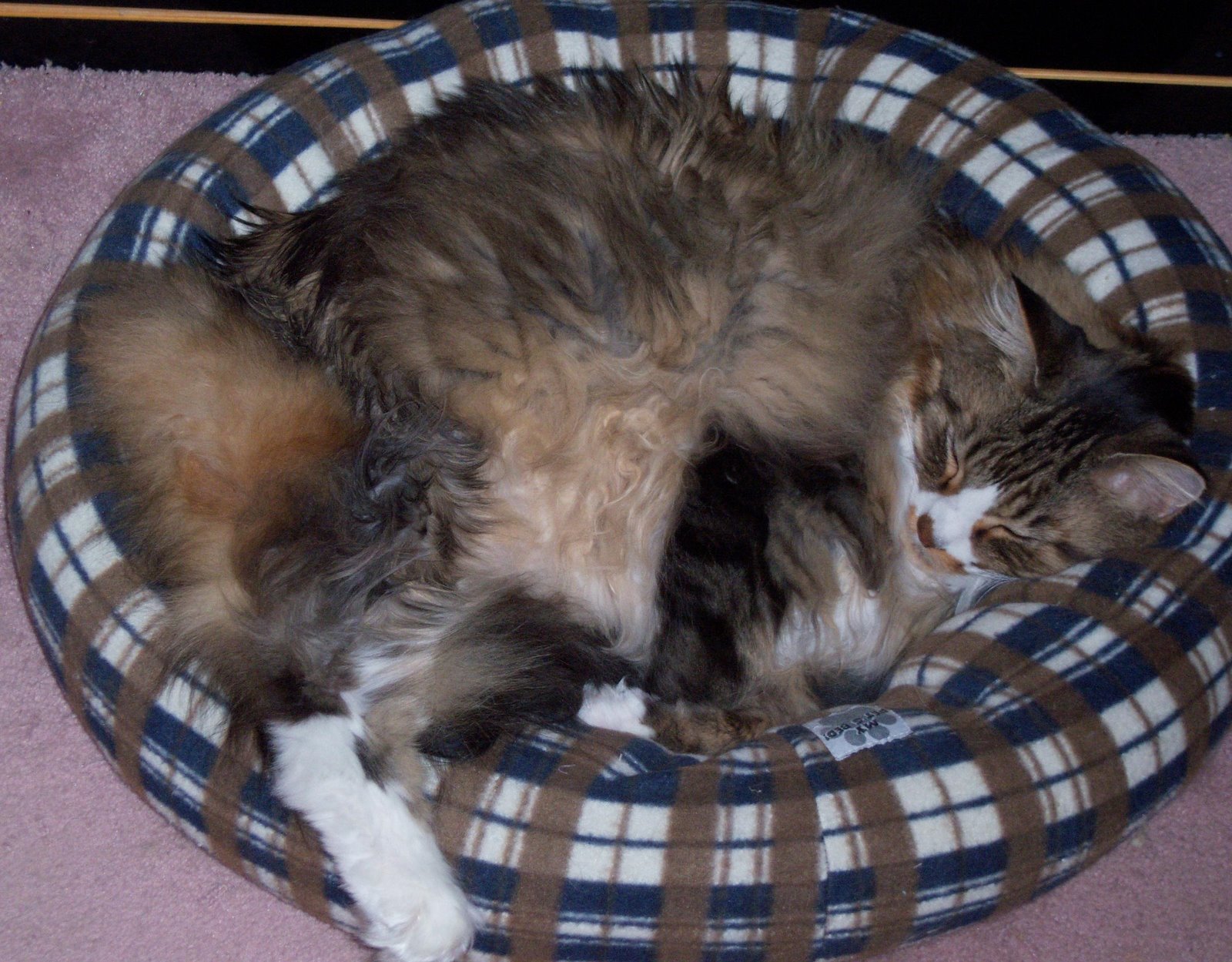 Smudge with one paw hanging out of the kitty bed — temperature control maybe?