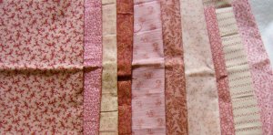 A quilting friend (no-blog friend) and I are exchanging cuts of pinks to print our diamonds on for these blocks. These are the pinks I received from her. Not one duplication!! This is so much fun!!