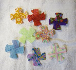 Take a look at this, done by Tilde, with quarter apple cores. I love tessellating patterns and as soon as I saw what Tilde had done, I just had to print a few of the quarter apple cores. These little units go together unbelievably quickly!! I have some Kaffe Fassett prints and have printed enough on 23 of them to make 4 blocks. I’m thinking of another baby quilt — very bright and cheerful. I couldn’t resist.