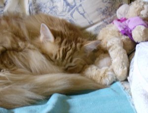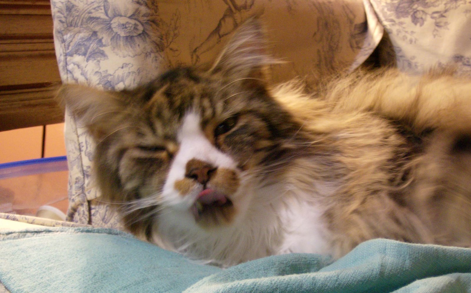 Although this picture is a bit fuzzy, I couldn’t resist posting it. If you click on the picture to see the larger version, you’ll see that Smudge has his tongue sticking out just a bit.