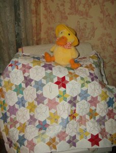 Congratulations!! It is done, and it looks fabulous. Love that ducky with it — will that be part of the gift? Sorry I didn’t get to weigh in yesterday, but I love the idea of yet another series. There’s so much you can do with that star shape.