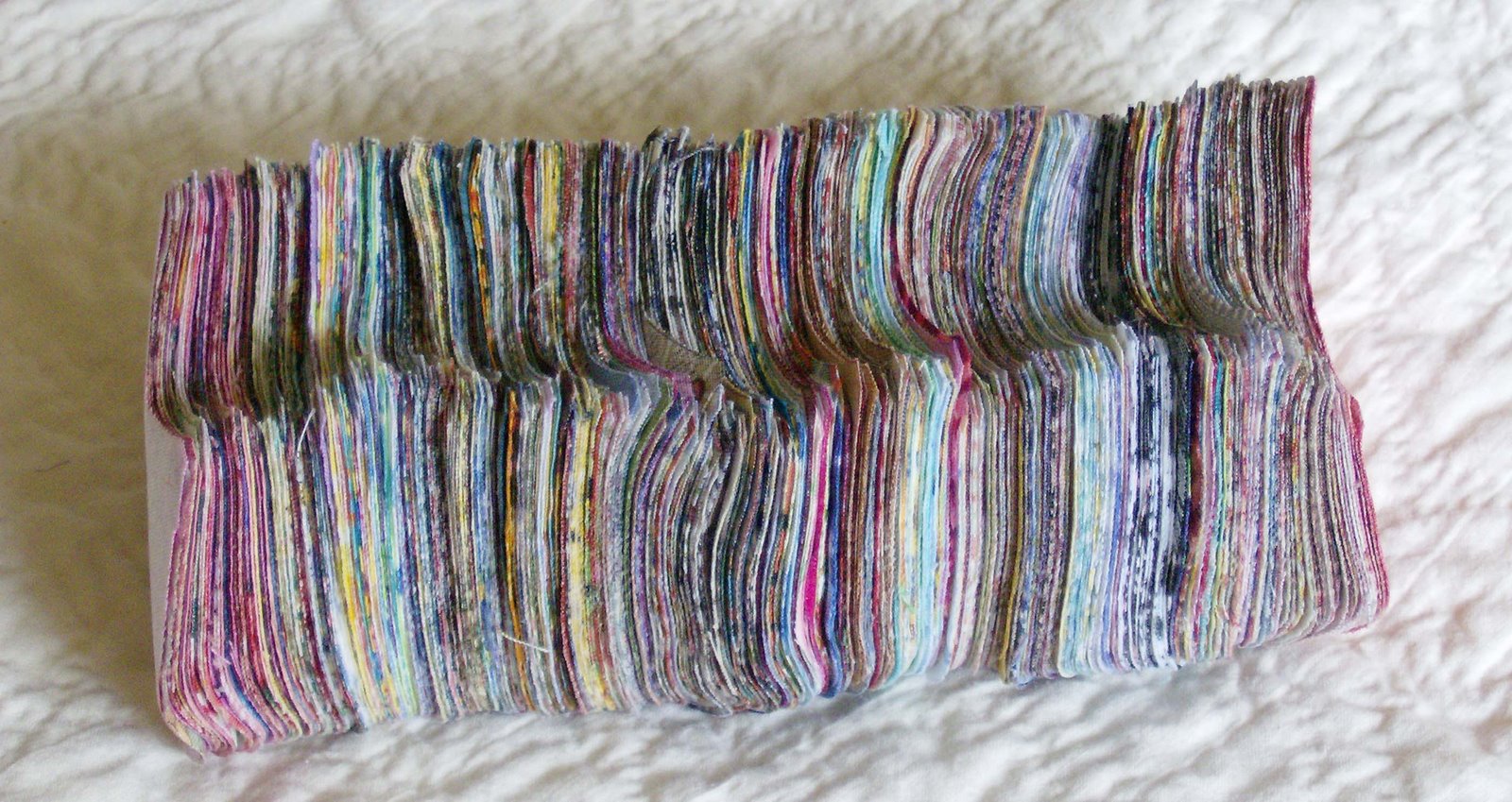 There was recently a charm swap of apple cores which I hostessed on the Inklingo list. This is the result which all the participants received — approximately 360 apple cores, all different except for possibly one or two. While that may not be enough for a bed-sized or even large lap quilt, it’s more than enough for an interesting wall hanging or two. I’m playing with the idea of making a couple of small monochromatic quilts using these. In the meantime, they’re part of another Quilter’s Emergency Kit box — so whenever I feel like stitching some curves and want to play with colour, there they are.