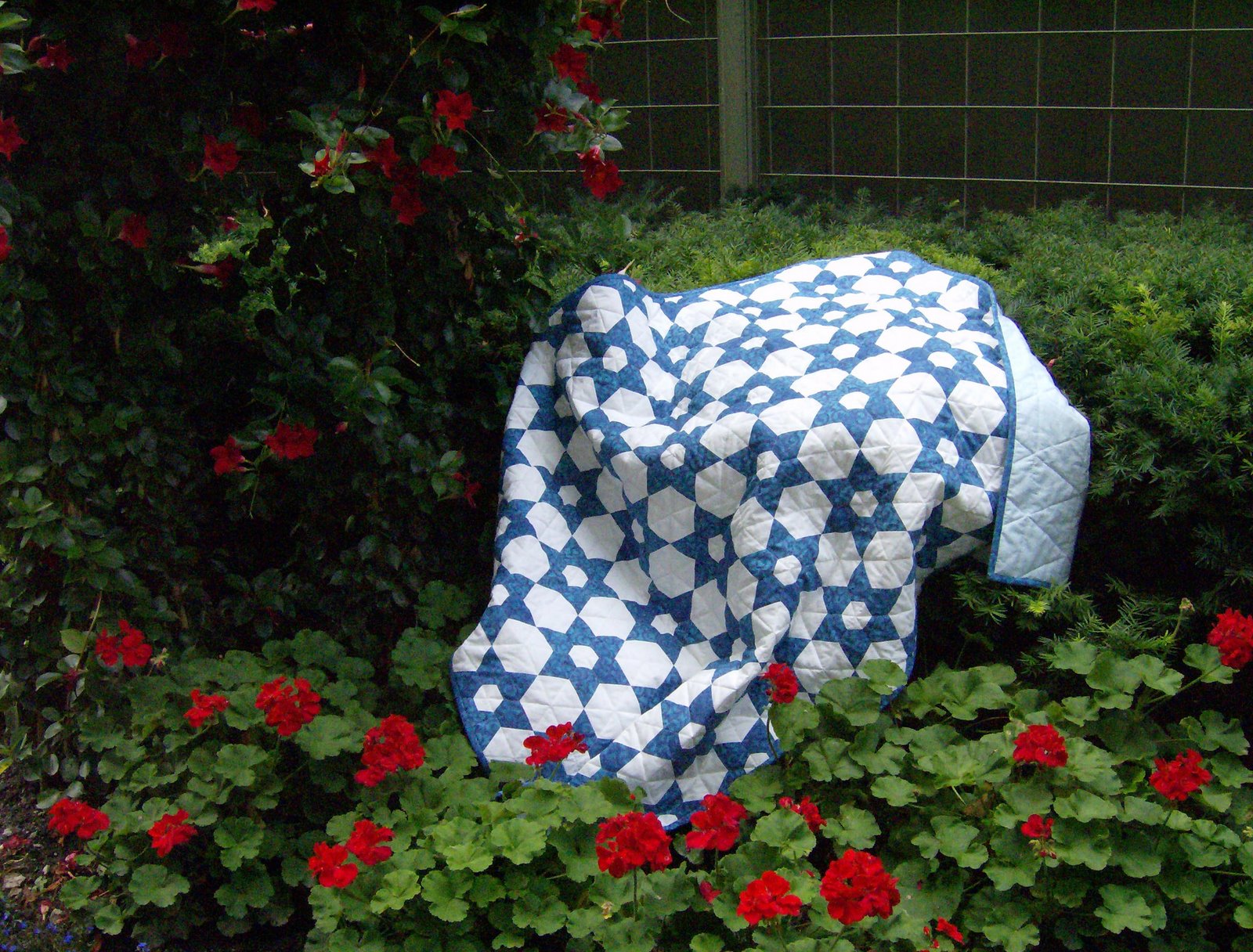 This is one of my favourite quilts. It’s hand pieced and is the first of a series of one-colour quilts I hope to make. This was an amazingly easy pattern to make and one that I’d like to repeat using a different colour fabric for each star. I may make a small one as a baby quilt. It goes together very very quickly and, because of the hand piecing, is perfect for lots of lovely continuous stitching.