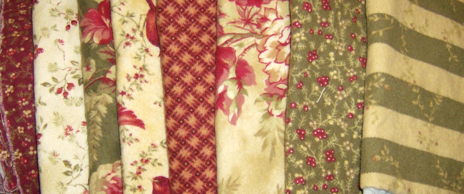 Then there are these wonderful flannels. There’s a half-yard cut of each. Again, I cannot think of what to make with them. A nice cozy lap quilt for next winter is what I want to make with them, but coming up with a pattern? I keep thinking stars of some sort but never having worked with flannel other than for a backing, I have no idea how hard it’s going to be to get nice sharp points. Whatever I make, I think I’ll save the green and cream striped fabric for the binding. I love using a stripe for bindings.