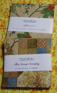 What is it about charm packs? I absolutely love them! A friend, whose husband comes to Toronto every quarter, and I send little gift bags back and forth to one another — thus earning her husband the nickname of the “fabric mule”! We did the gift bag pick-up and drop-off on Tuesday. In my gift bag I found these two wonderful charm packs! I am thrilled! I had a lot of fun putting her gift bag together this time as she’s in the midst of a move. Once I know she has received it, I’ll talk about what all was in it!