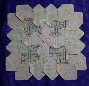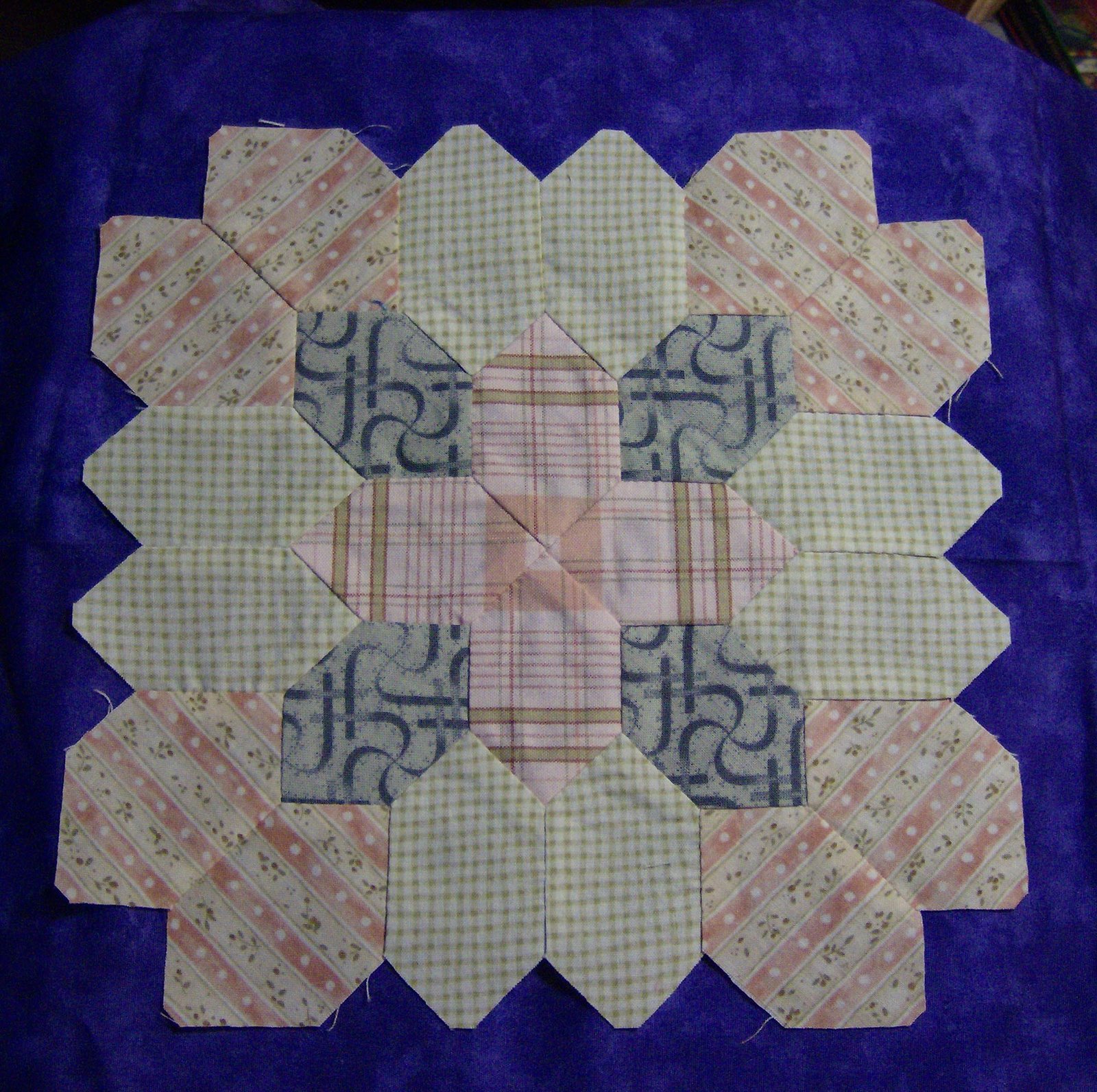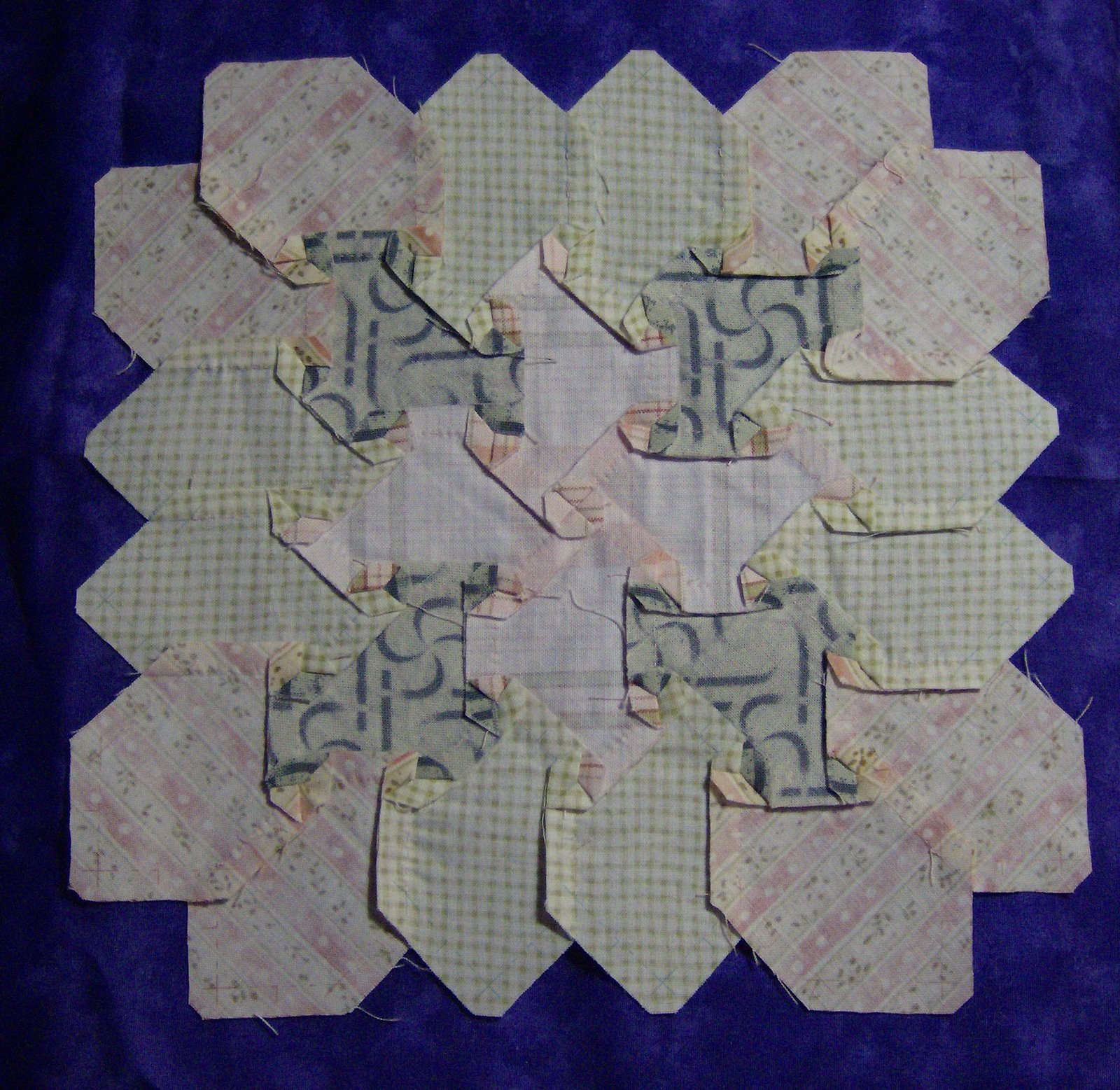A very soft and pretty block and I am so impressed at the way you got the stripes to match in the outside corner hex’s.I can see why you might want to save it for a special project compared to the others.