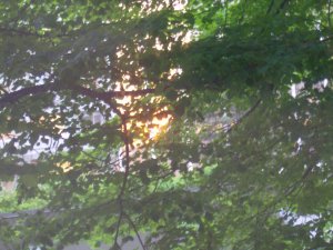 I couldn’t resist this shot — as the sun was going down, it was reflecting off the glass in one of the office towers and the gold shining through the leaves was really pretty.