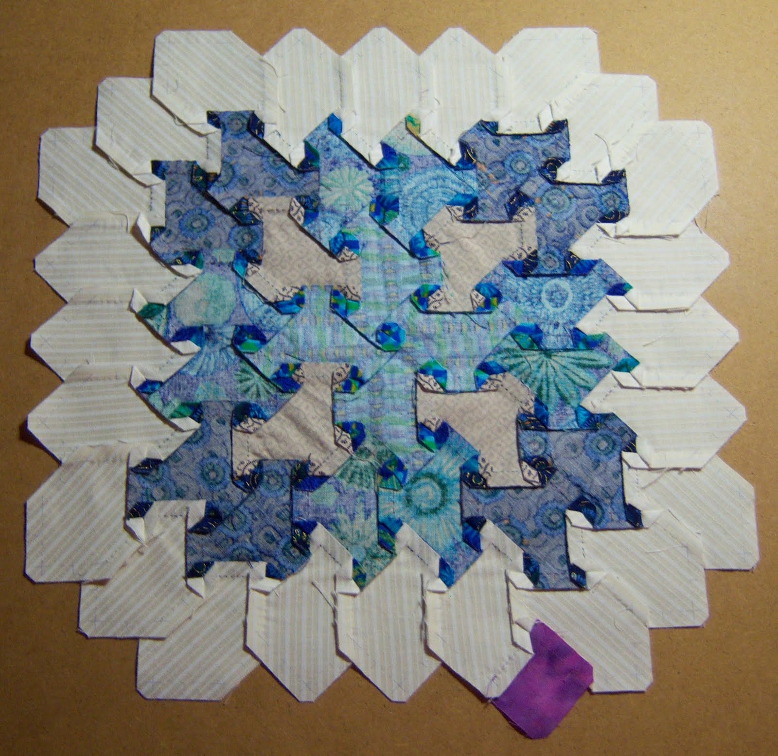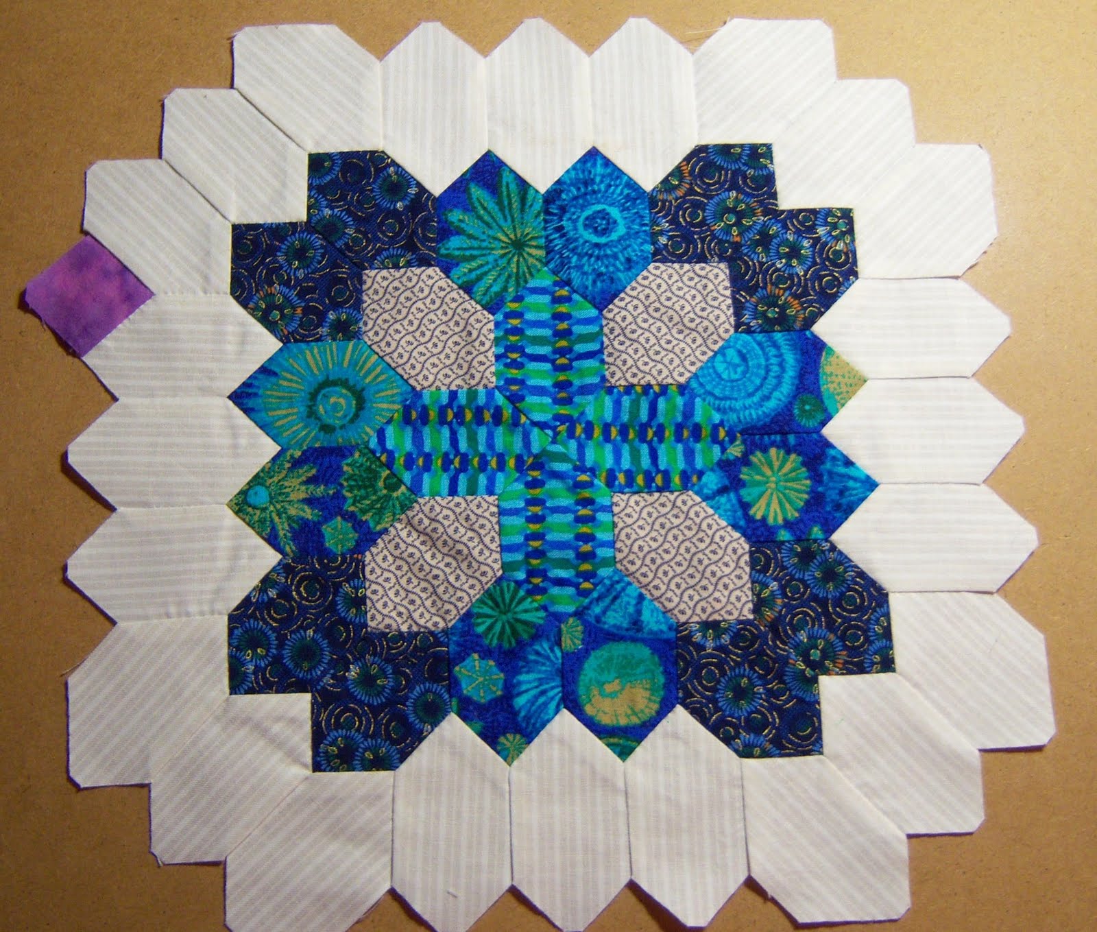 But for now, the dark blue POTC block has been framed and a start made on joining the purple squares to it.