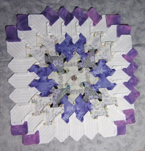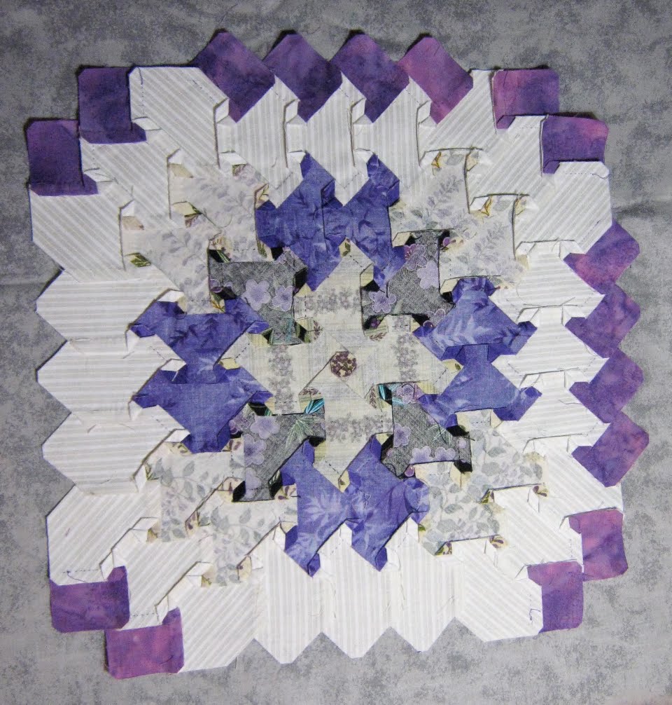 The very first POTC block I made and what is probably my favourite block was up next for framing with the cream hexagons and squares. The camera had trouble with the one of the purples in the block. The long hexagons that appear to be a blue purple are much more purple than they appear.