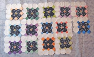 And, for fun, I decided to lay them out. No kitty helpers came to investigate, which rather surprised me. I’m a long way from finished. There are 154 blocks in the quilt, so I still have 140 to go!