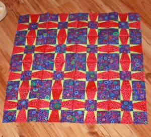 … is now done! I love the secondary pattern that appears and have plans for another small quilt using different fabrics that will showcase yet another secondary pattern. This little quilt top measures 24″ square.