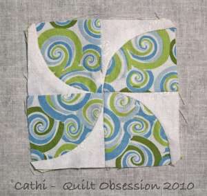 My plan for the Clams on the Half Shell quilt is to add 3 small borders.  The second border will be made up of these little blocks made from quarter clamshells.  Each block measures 3″.   They’re amazingly quick and easy to stitch, as it takes very little time to get each seam done.