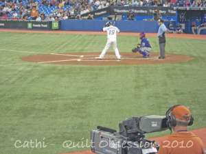 The baseball game was fun, although the Jays lost.  At least we saw Bautista hit a home run, his 44th of the season.  We had amazing seats, 11 rows up from the field and so close to the field on the third base side that we could hear the home plate umpire.  The thing that struck me most was how much the television cameras distort what we see when watching the games on television.  The players, when shown on television, look much bigger than they are.  Seeing them in person I realized just how many pounds the camera does actually add!  This photo was taken at one of Bautista’s at-bats, but not the one when he hit the home run.