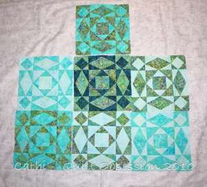 I wanted to get all the Storm at Sea shapes printed on the fabrics and ready to stitch before I somehow or another “borrowed” one of those fabrics for use in something else.  Two of the fabrics I’ve picked for this are batiks with a slight dusting of a gold metallic that I think are going to look rather like light reflecting on the water.  The best part of this is I know I won’t get bored making the blocks as each one will be slightly different.  There will be 41 blocks to go once I get the current one finished.