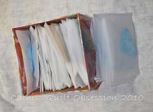 This box has the remaining pieces, all sorted in envelopes by fabric, ready to be pulled and put into block envelopes to join those in the first box.  I love having lots ready to stitch like this.