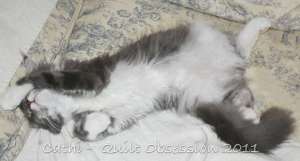 Baxter wasn’t particularly interested, although I have a feeling if I left it where he could get it I’d find some kitty tooth marks. This is one of his favourite poses when sleeping and one that always make us laugh.
