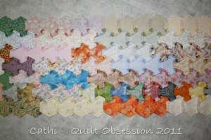 I press as I add each strip. When I made the king-sized 1″ hexagon and elongated hexagon quilt, I left all the pressing to the end. It took next to forever to press that top and my back was practically breaking from the hours I spent at the ironing board. Lesson well and truly learned!