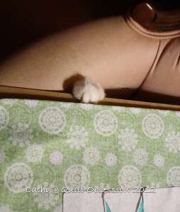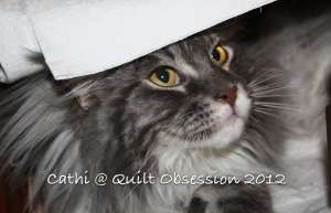 When we’re taking photographs of the little quilt blocks, we usually have a board propped up on the chair Baxter has claimed as his own. And most of the time he then jumps up and wiggles his way under the board. Sometimes he peeks out. Mr. Q.O. captioned this shot, “Is that thing gone yet?”
