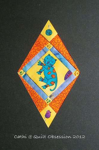 As does this kitty diamond. A lot of fussy cutting was done so I could get the mouse, the paw prints, the ball of yarn and the kitty centred in each of their respective pieces.