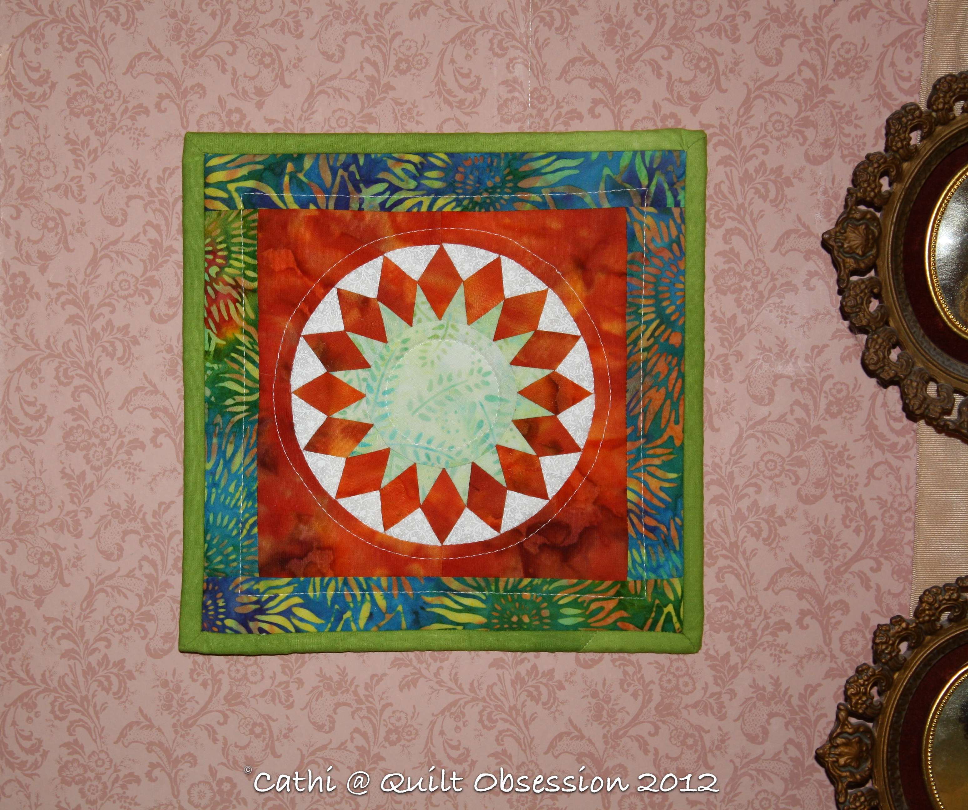 A scrap of silk batting, a little machine quilting and it was done. I used the fast finish triangles method shown on the Alzheimer’s Art Quilt Initiative for the hanging method. It works perfectly for a small quilt like this.