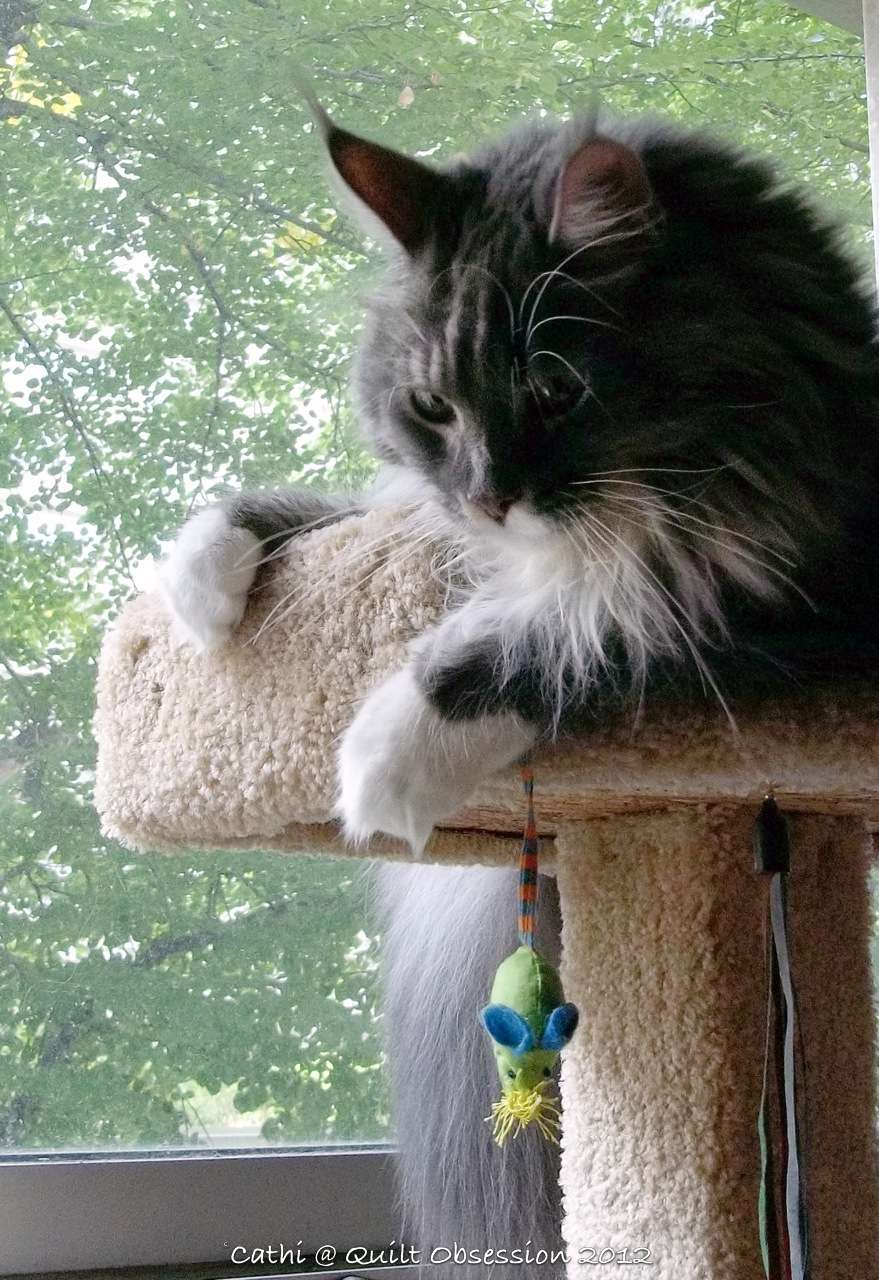 On the top perch again. With a kitty toy. Mr. Q.O. captioned this one “Don’t drop that mouse!”