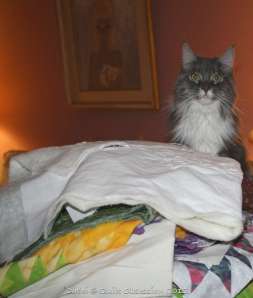 I was sorting through various blocks and small quilt tops and, at one point, had some of them piled up on top of the couch. Baxter couldn’t resist investigating. Mr. Q.O. captioned this one “The Fabric King.”