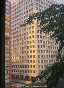 This was our view out the living room window yesterday, late in the afternoon. At this time of year, when the sun hits the buildings there is often a pink cast to the buildings. Even though it was quite windy yesterday, we still have loads of green leaves left on the trees.
