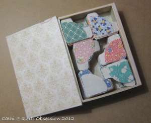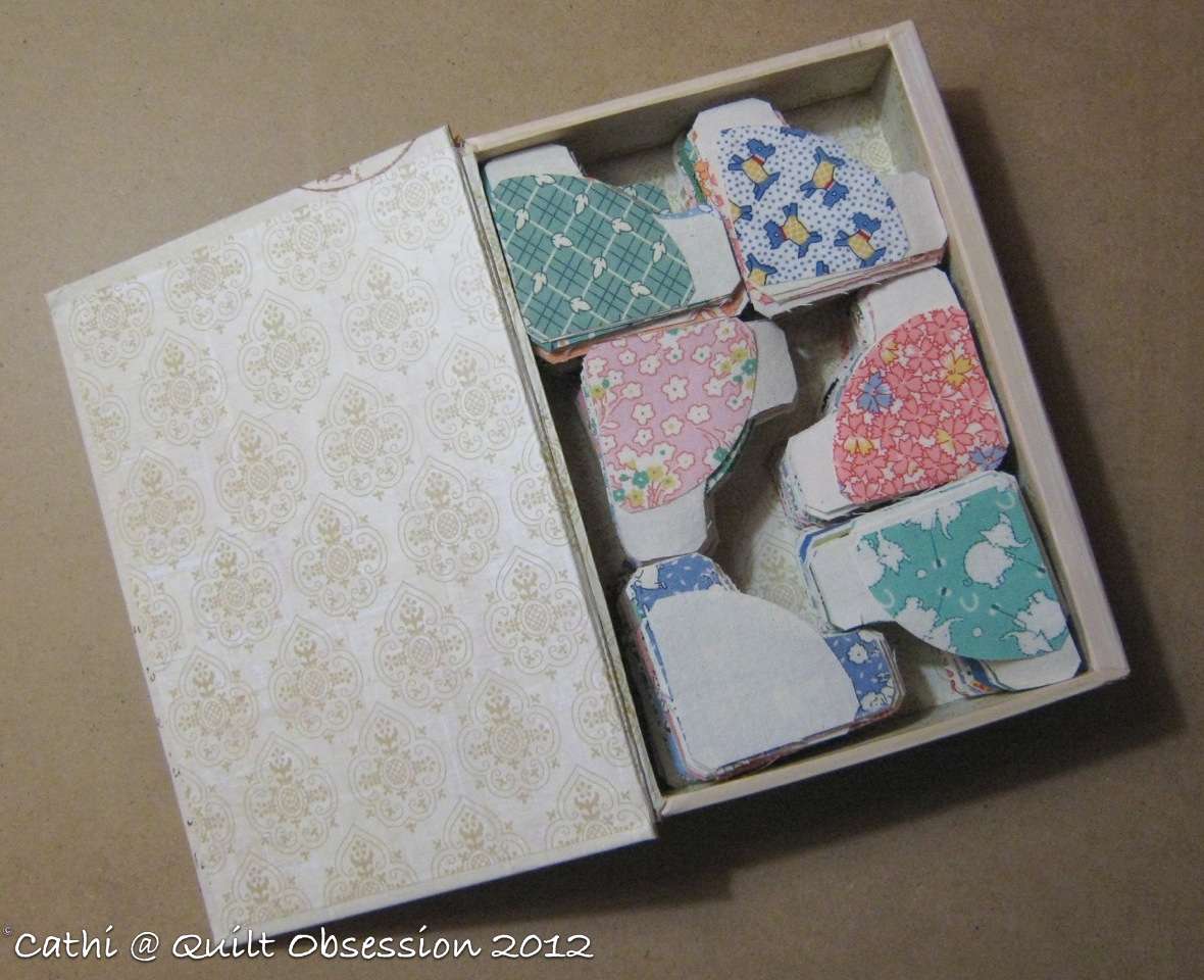 The 2″ Drunkard’s Path project box. Once all these are stitched, I’ll have everything I need for the quilt I’m making which was inspired by a quilt in Ontario’s Heritage Quilts.