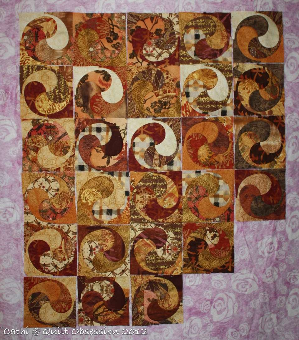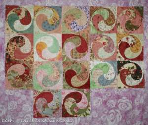 Before the Memories of Smudge blocks took over the design wall, I put the shabby chic Yin Yang blocks up just for fun. There are still 20+ of these blocks to make. I’m not sure how I’m going to arrange them yet, but may decide to do another “S” arrangement.