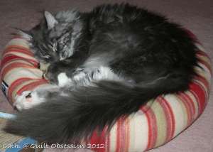 He was a very busy kitty on the weekend, chasing leaves as they flew by the window and playing his new favourite game which involves us tossing one of his toy mice to him and him batting them right back at us. Sunday night he was crashed in one of his kitty beds.