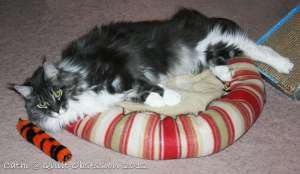 After all that excitement, he had to relax, sprawled out in his kitty bed.