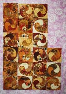 What a struggle it has been to figure out the block placement now that I’ve added  a measly 5 more blocks to the equation! I think I’m going to forget trying for the “V” effect and just have some lovely cream S’s showing up throughout the quilt. At this point I’ve spent hours arranging the blocks, rearranging them and then rearranging them again. This is where it was at last night when I gave up for the evening. The top left corner needs a little work as I think it’s too dark and the block that’s part of the cream S on the right needs to be turned so that it does form an S. I’ll work on it some more this afternoon and see if I can finally get this to the point I can start joining the blocks again.