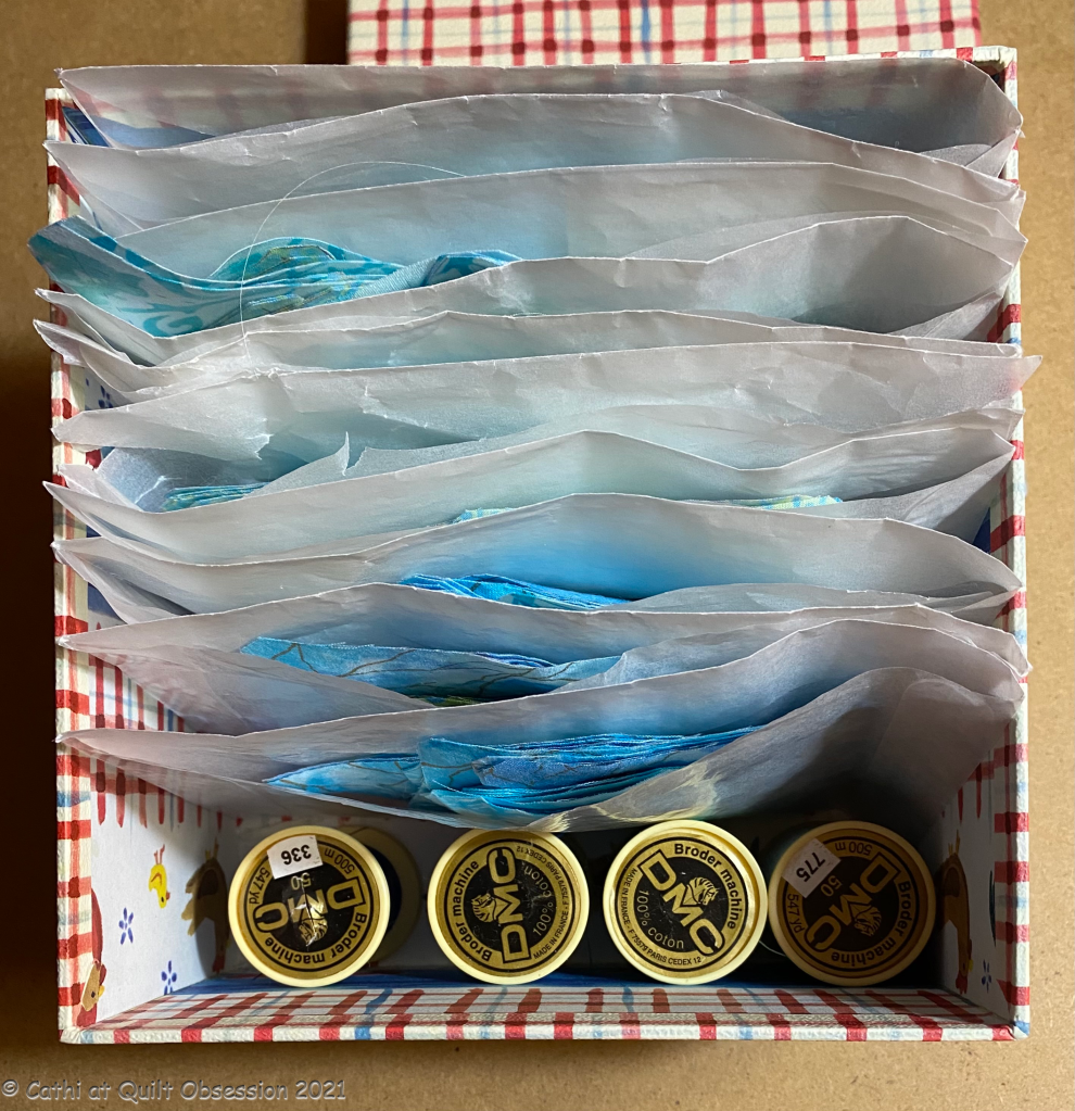 That was September 2018, well over three years ago. Now there are only ten blocks left to make. Each envelope in this box has all the pieces needed for one block and, as usual, I’ve selected the blue thread that is the best match for each block left to be sewn. So once Christmas Fireworks is complete, I will be moving on to finish up Stormy Seas. I’m glad that the lines printed on the fabric with Inklingo haven’t faded after all this time! I can’t believe I started it in March 2010, over 11.75 years ago. I know some projects have to marinate, but this one has marinated far, far, far too long!! I’m hoping that ‘fessing up to it on my blog will help me stay the course and get this one done!